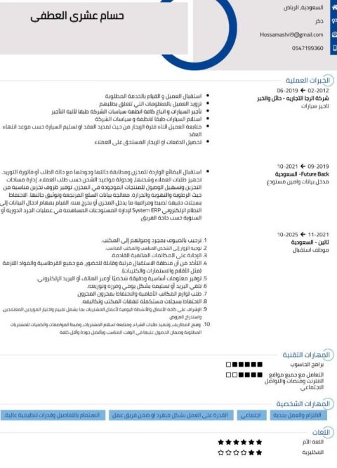 خبرات عملية متنوعة 10 سنوات (إدارة المستودعات والمخازن / الاشراف الميداني الرقابة والمتابعة والتقييم / الأرشفة وادخال البيانات ورفع التقارير) رخصة وإقامة ساريتين
