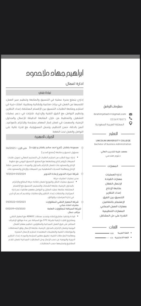 أنا إبراهيم جهاد خريج ادارة أعمال ومعهد هندسي عندي خبرة أكثر من 7 سنوات بعدة مجالات من ضمنها التنسيق والمتابعة وادارة العمليات في شركات كبرى السي في مرفق باللغتين الانجليزية والعربية