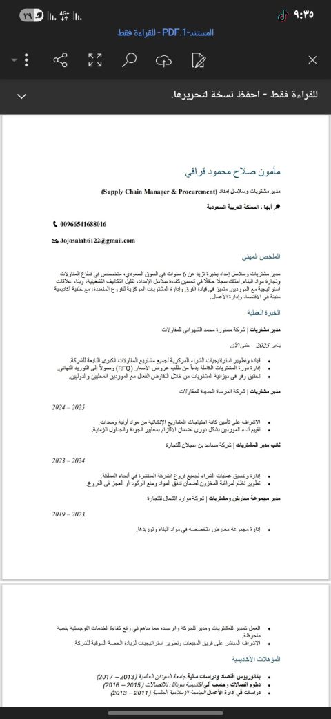 مدير مشتريات وسلاسل إمداد الملخص المهني مدير مشتريات خبير بخلفية أكاديمية قوية في الاقتصاد وإدارة الأعمال. امتلك خبرة عملية واسعة في السوق السعودي، تتركز في إدارة المشتريات، توريد مواد البناء، وإدارة العقود والمقاولات. متميز في تطوير استراتيجيات الشراء، وتقليل التكاليف، وإدارة سلاسل الإمداد بكفاءة عالية تدعم أهداف النمو المؤسسي