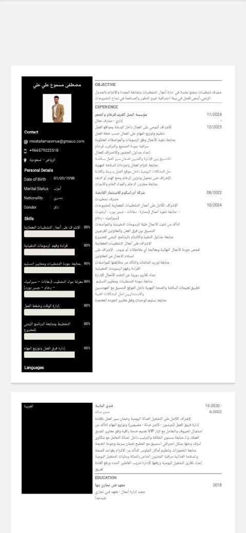 أنا مصطفى مسموع مصري الجنسية خريج معهد فني تجاري والإقامة سارية التشطيبات ومجال الرخام في ورش الرخام أو المعارض والاشراف على العمال