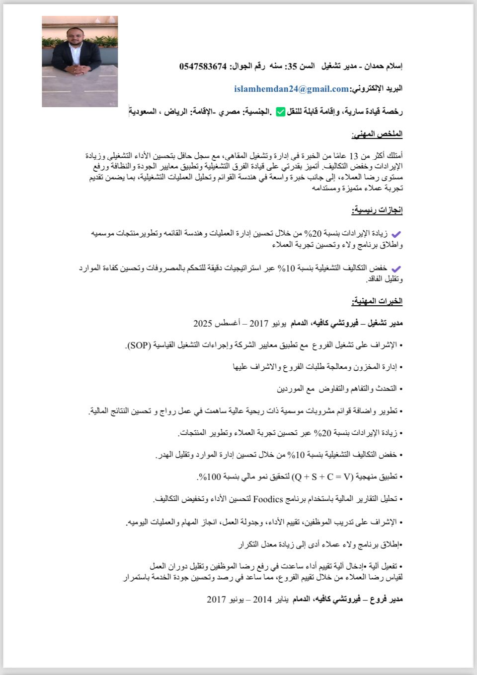 مدير تشغيل محترف لدى خبرة أكثر من 10 سنوات في قطاع المقاهي، متخصص تشغيل وإدارة - اعداد وهندسة المنيو - تقليل التكاليف وزيادة الربحية - تدريب وإدارة فرق العمل - تطوير الأداء ورفع المبيعات - فهم عميق لأساسيات القهوة والريسبى وتحضير المشروبات والنسب