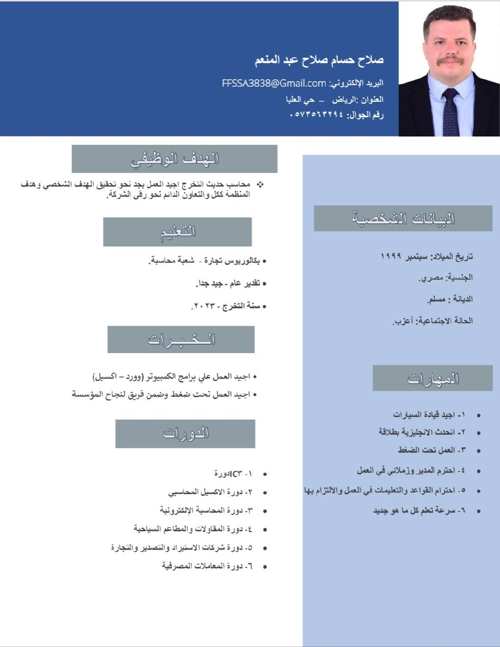 محاسب حديث التخرج يجيد التعامل على الكمبيوتر بشكل عام التعامل على برنامج الاكسل والورد التكييف مع طبيعة الشغل والتعلم بسرعة واشتغلت فترة في مكتب خدمات عامة