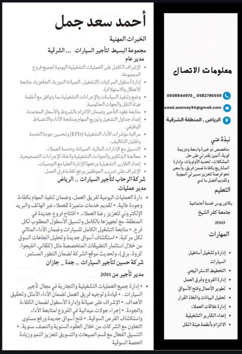 مدير عمليات في مجال تأجير السيارات. امتلك خبرة عملية أكثر 15 عام في إدارة وتشغيل نشاط تأجير السيارات، تشمل الاشراف على الأسطول وإدارة الفروع ورفع كفاءة التشغيل والتحصيل، اضافة الى تطوير الأداء وتحقيق أفضل مستوى من خدمة العملاء