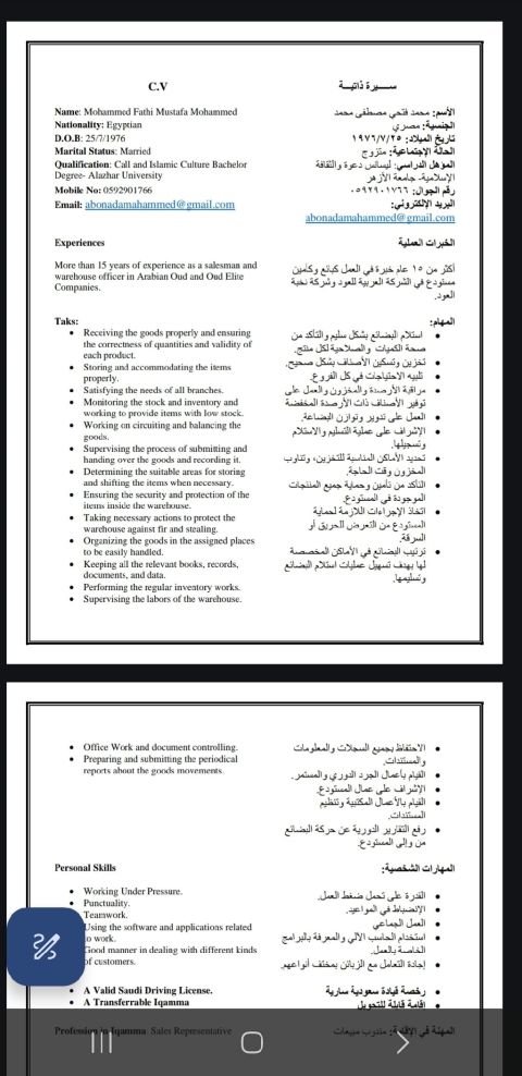مسؤول مخزون خبرة 2 سنة في ادارة المخازن وتحليل المخزون وتخطيط الطلبات وسلاسل الأمداد والتمويل لدي خلفيه قوية في استلام ومراقبة المخزون وتطبيق معايير الجودة داخل المخازن، لدي خبرة في التعامل مع أنظمة ERP (SAP) وبرامج الأوفيس (أكسيل، وورد، power bi, outlook) واعداد التقارير الدوريه عن حركة المخزون. تسجيل حركة المخزن في (SAP ERP, Excel للمستودع الرئيسي للشركة. عمل جرد دوري للمخزن وتسجيل ومراجعة