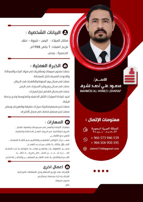 مقيم يمني لدي اقامة سارية المفعول وشهادة صحيه ورخصة قيادة لدي خبرة في التسويق والمبيعات ادارة فروع خبرة 6 سنوات