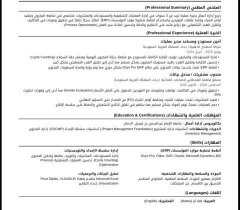 محاسب حديث التخرج - الخبرات السابقه - مشرف موقع + رقابة المستودعات وإدارة المشتريات - كما عملت في قسم الجودة في شركة السواحل الوطنيه + إدارة ورش صناعية