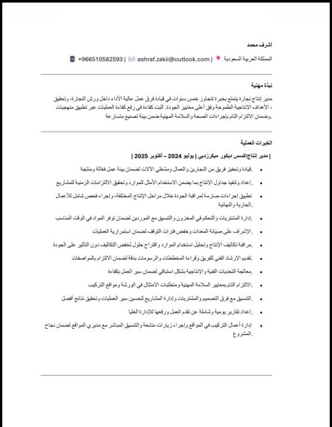 مدير انتاج نجارة بخبرة 5 سنوات في إدارة مصانع الأثاث والديكور، متخصص في رفع الانتاجية ضبط الجودة خفض التكاليف، وقيادة فرق العمل بكفاءة عالية خبرة قوية في التخطيط، المشتريات، المخزون، السلامة المهنية، والاشراف على التصنيع والتركيب. ابحث عن فرصة في مصانع الأثاث أو شركات النجارة وال Fit - Out لاضافة قيمة حقيقية وتحقيق نتائج ملموسة