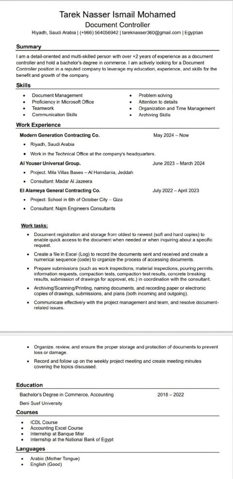 I am looking for a job opportunity as a document controller. I have 3 years of experience in contracting companies. I have skills in organizing and managing documents and papers and dealing efficiently with document management programs. I am distinguished by my accuracy and attention to detail