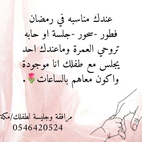جليسة ومرافقه اطفال بالساعة نصف يوم - كامل رعاية واهتمام كامل بالطفل امكانية مرافقة الطفل في المناسبات وقاعات الأفراح. الموقع مكة للتواصل