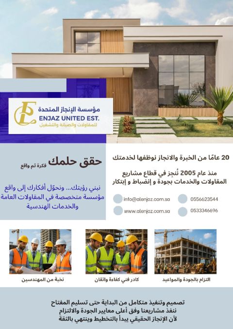 مؤسسة متخصصة في المقاولات العامة والخدمات الهندسية تصميم وتنفيذ متكامل من البداية حتى تسليم المفتاح ننفذ مشاريعنا وفق أعلى معايير الجودة والالتزام لأن الانجاز الحقيقي يبدأ بالتخطيط وينتهي بالثقة، تنفيذ مشاريع كبرى وفق المواصفات الفنية والجدول الزمني خبرة في المولات - الأبراج - الفلل - القصور - المباني التجارية إدارة مشاريع احترافية، كوادر هندسية من النخبة