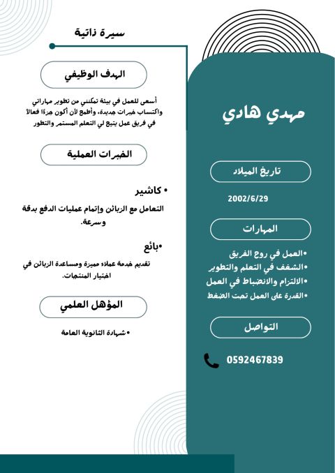 معكم شوقي محمد علي، مقيم في المملكة العربية السعودية، لدي خبرة في خدمة العملاء وتشغيل أنظمة الكاشير (POS) وادخال البيانات، مع مهارات تواصل ممتازة بالعربية والانجليزية. ابحث عن فرصة عمل في مجال (خدمة عملاء / كاشير / استقبال / ادخال بيانات) الإقامة سارية، جاهز للعمل فورا. أتشرف بإرسال السيرة الذاتية، وشكرا لكم. رقم التواصل