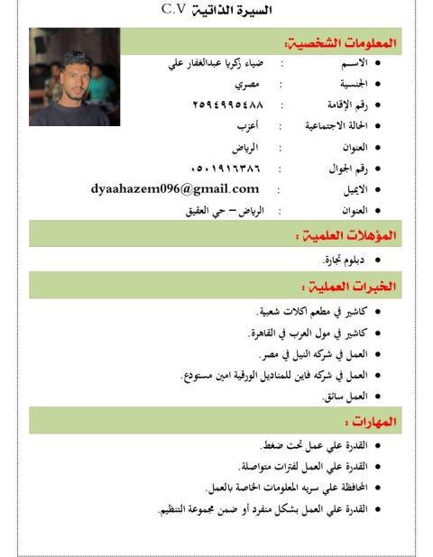 معكم شوقي محمد علي، مقيم في المملكة العربية السعودية، لدي خبرة في خدمة العملاء وتشغيل أنظمة الكاشير (POS) وادخال البيانات، مع مهارات تواصل ممتازة بالعربية والانجليزية. ابحث عن فرصة عمل في مجال (خدمة عملاء / كاشير / استقبال / ادخال بيانات) الإقامة سارية، جاهز للعمل فورا. أتشرف بإرسال السيرة الذاتية، وشكرا لكم. رقم التواصل
