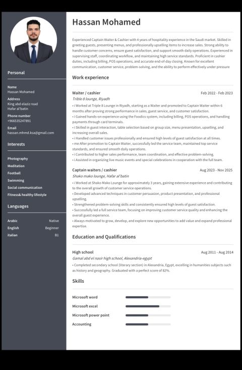 شاب مصري اعمل كابتن وايتر وكاشير خبرة 4 سنوات داخل السعودية أجيد التواصل مع العملاء والتسويق والعمل تحت الضغط ولدي خبرة للعمل مع البرامج المحاسبية وأجيد اللغة الانجليزية ابحث عن عمل وجاهز للبدء فورا