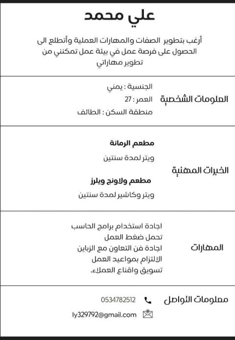 ابحث عن عمل في الطائف وايترا كاشير العمر 27 الجنسية يمني إقامة سارية وكرت صحي ساري