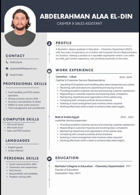 بدور عل فرصه شغل كويسه أنا خريج بكلوريوس تربية قسم كيمياء واشتغلت في حاجات كثير وعندي خبرة في حاجات كثير في المحاسبه أو كاشير أو شغل المشتريات أو بقالة أو استقبال فندق واشتغل عل الكمبيوتر كويس أي حد قداموا فرصه كويسه يكلمني وجزاكم الله كل خيرا