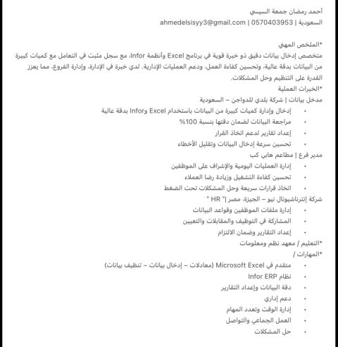 مدخل بيانات متاح للعمل (دوام كامل / جزئي - عن بعد أو ميداني) امتلك خبرة في ادخال البيانات بدقة وسرعة عالية، مع اجادة استخدام برامج Microsoft Office خاصة Excel وWord. لدي مهارة في تنظيم الملفات، تدقيق البيانات، والالتزام بالمواعيد النهائية. أتميز بالتركيز، تحمل ضغط العمل، والالتزام بالسرية المهنية. جاهز للعمل فورا داخل المملكة أو عن بعد