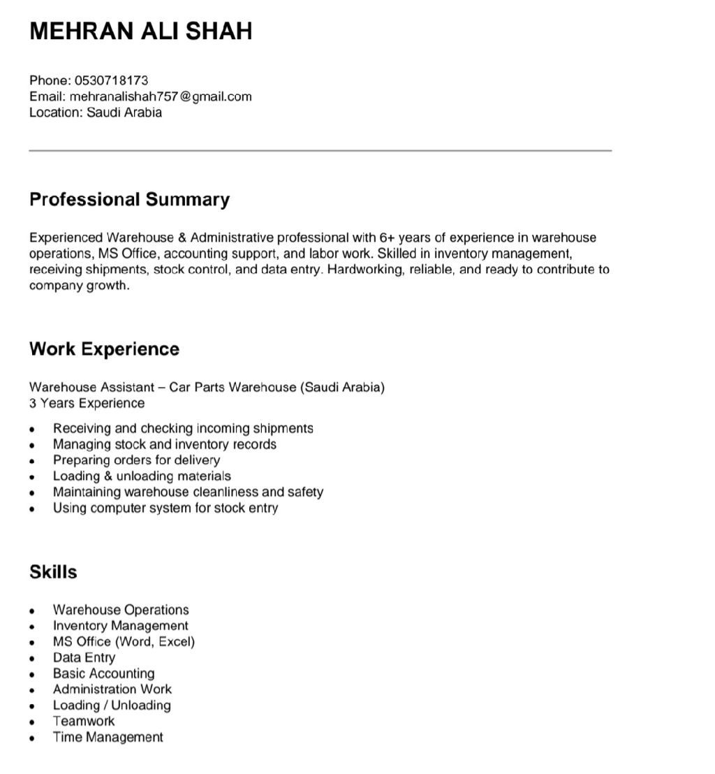 محترف مجتهد وموثوق به، يتمتع بخبرة ثلاث سنوات في عمليات المستودعات والإدارة والدعم المحاسبي. يجيد مراقبة المخزون وادخال البيانات واستخدام برامج مايكروسوفت أوفيس. يتمتع بحضور قوي