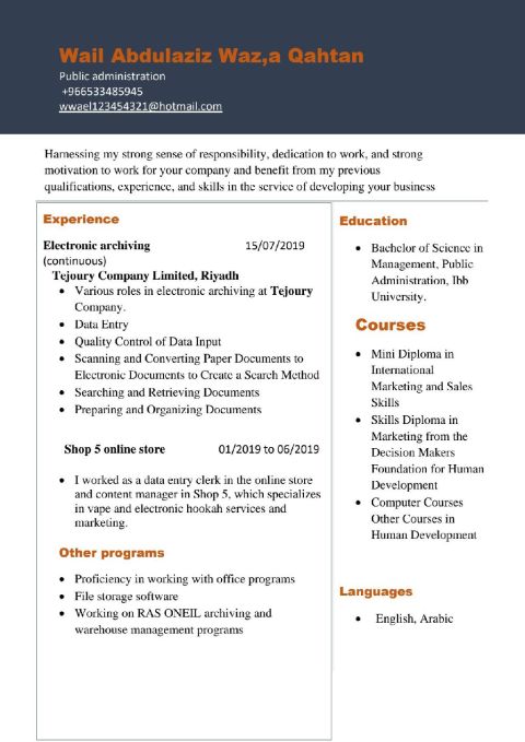 مصري مقيم في الرياض قابل لنقل الكفالة، وقد عملت لدي شركة الوزن المثالي للتجارة اللتي مقرها في الرياض. لدي خبرة كبيرة في استخدام الحاسب الآلي وبرامج الأوفيس خاصة الوورد والأكسيل، محترف في كتابة التقارير والايميلات والأعمال المكتبية والتسجيل في المنصات الحكومية وادارة فريق العمل، لغة عربية وانجليزيه ممتازة شخص أمين ومجتهد وحريص علي نجاح بيئة العمل ابحث عن فرصة عمل في مدينة الرياض
