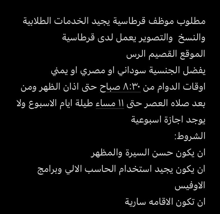 مطلوب موظف قرطاسية ونسخ وتصوير سوداني يجيد الطباعة والخدمات الطلابية نقل كفالة بأسرع وقت يرجى قراءة الشروط كاملة في الصور العمل في الرس حي الملك فهد