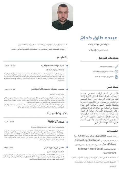 أنا مصمم جرافيك ومسوق محترف عملت في وكالات وشركات عدة في سورية وحققت نتائج قوية حاليا حيت السعودية وابحث عن عمل يناسب خبراتي وهي 1 - التصميم الجرافيكي من هويات بصرية واعلانات وكل شيء 2 - ادارة حسابات السوشيال ميديا واستخدام استراتيجيات لزيادة الزيارات والمتابعين وصنع محتوى يجذب الزبائن 3 - ادارة أمان الحسابات والتنزيل اليومي أو شبه يومي عليها واستعمال استراتيجيات قوية للتنزيل 4 - تصميم فيديوهات اعلانية