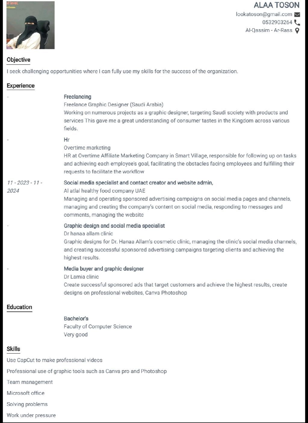 لدي خبرة في الجرافيك والماركيتنج سنة ونصف. ابحث عن فرصة عمل مناسبة لا يشترط جرافيك. ابحث عن وظيفة كاشيره. أو سكرتيرة. أجيد التحدث الانجليزية أجيد التعامل مع الكمبيوتر. أجيد السواقة ولكن لا يوجد لدي سيارة ابحث عن وظيفة بالرس