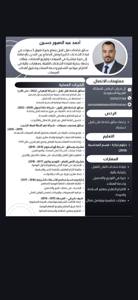 سائق شاحنة نقل ثقيل وأحمل رخصة نقل ثقيل وكارت سائق والإقامة والرخصة ساريتين