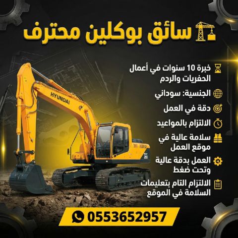 سائق بوكلين محترف خبرة 10 سنوات في أعمال الحفريات والردم دقة في العمل التزام بالمواعيد سلامة عالية في موقع العمل بدقة عالية وتحت ضغط الالتزام التام بتعليمات السلامة في الموقع