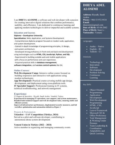 خريج Software. مطور مواقع مبرمج أنظمة، مبيعات تسويق، خدمة العملاء، محاسبة أجيد اللغة الانجليزي والتركية خبرة بالتعامل مع الاستضافة (Domain) التعامل مع الكلاود، والنسخ الاحتياطي