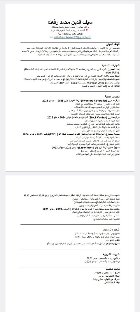 مشرف مستودع ومشرف مبيعات العمل لدى شركة أكثر عناية العالميه للتجارة مشرف مستودع من 2020 الى 2024 ملم بإدارة المخزون وملم باشتراطات هيئة الغذاء والدواء وملم أيضا في السلامة المهنية سيفتي العمل ع برنامج فوكس 7 و9 العمل مشرف مبيعات من 2024 الى الآن