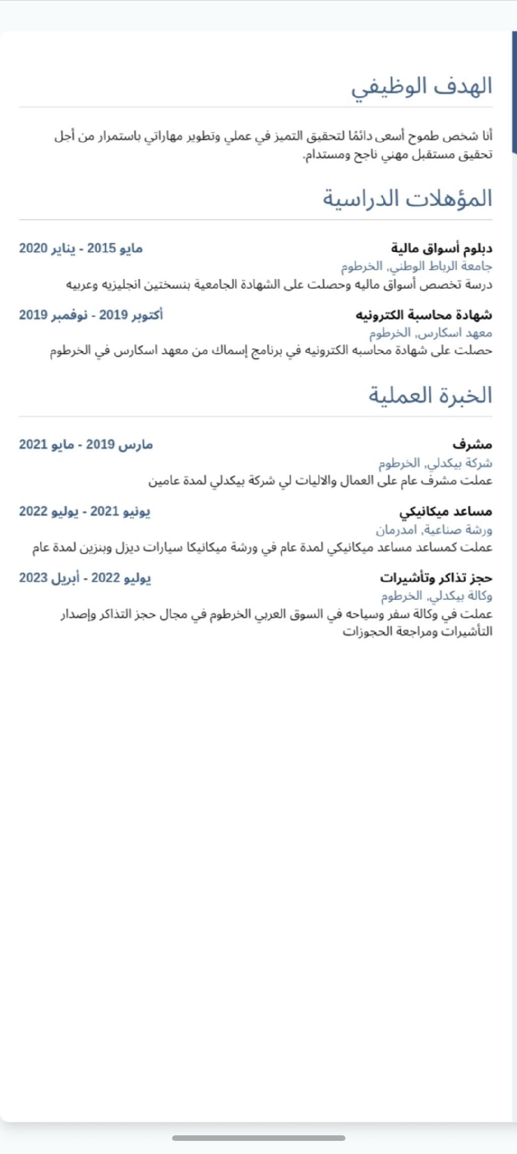 سوداني موجود في مدينة جدة ابحث عن فرصة عمل في مجال المحاسبة أو الخدمات العامة أو مدخل بيانات أو مشرف أو مندوب أو مسوق أو أي وظيفة بدخل ثابت لدي شهادة جامعية في مجال الأسواق المالية ولدي شهادة محاسبة الكترونية ابحث عن عمل أتطور وأطور به خبراتي وأبرز فيه مهاراتي واكتسب منه خبرات مستقبليا ابحث عن عمل أصل به الى مرحلة التطوير الذاتي لدي اقامة سارية ورخصة قيادة سارية