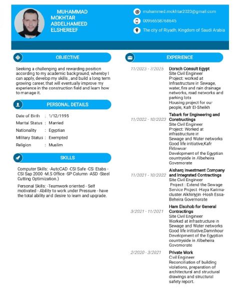 مهندس مدني خبرة أكثر من 12 سنة في التنفيذ والاشراف على المشاريع الانشائية والبنية التحتية ومحطات المياه والصرف الصحي. معتمد من وزارة البيئة والمياه والزراعة وشركة المياه الوطنية. خبرة قوية في إدارة المواقع، التنسيق مع الاستشاريين، وضبط الجودة. جاهز للعمل فورا داخل السعودية