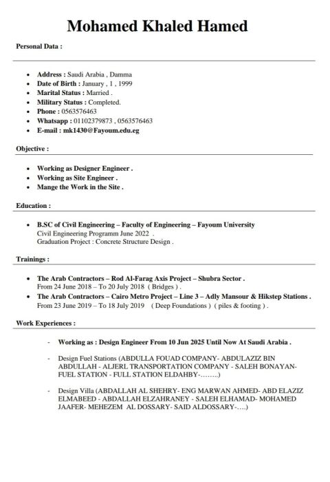 مهندس مدني مصري خبرة عشر سنوات في هيئة الأبنية التعليمية ودولة قطر قمت بالتنفيذ والاشراف على 80 مدرسة انشاء، الاشراف على 75 مدرسة صيانة، وتنفيذ 2 حمام سباحة نصف أولمبيي، ومجمع فلل، مشروع التخرج في "الأساسات" من أفضل مشاريع التخرج على مستوى الجمهوريه وتم التكريم من النقابة العامة المصريه وزير الاسكان دكتور مصطفى مدبولي حاليا رئيس الوزراء وايجاد البرامج الهندسية ولدى رخصة قيادة ورخصة دوليه