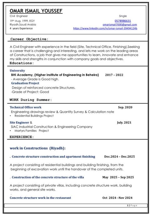 مهندس مدني بخبرة 5 سنوات في مشاريع البنية التحتية واللاند سكيب. متمكن من الاشراف الميداني، مراجعة الرسومات، حصر الكميات، اعداد التقارير، والتنسيق مع المقاولين والاستشاريين. أجيد AutoCAD وRevit وSAP2000 وSAFE وPrimavera. ابحث عن فرصة عمل مناسبة وجاهز للانضمام فورا