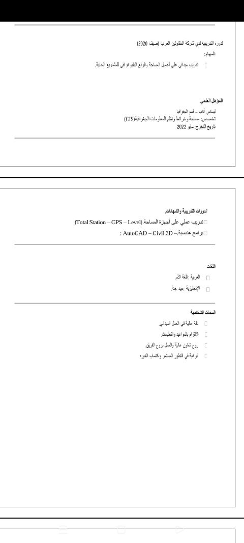 مساح عام متواجد بمدينة جدة جاهز للانضمام فورا للعمل خبرة أكثر من 10 سنة في الأعمال المساحية منها 8 سنوات بشركة Hassan Allam Construction بمشاريع مختلفة منها مشاريع إنشاءات وبنية تحتية (محطات مياه ومحطات معالجة ثنائية ومحطات تحلية) ومطارات مدنية وحربية اجادة تامة لاستخدام اجهزة المساحة المختلفة من Total Station GPS - Level) والبرامج المساحية Civil 3D AutoCAD) وعمل مخططات As - built وحصر الكميات