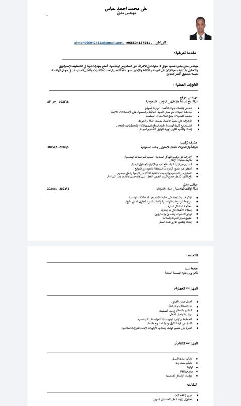 مهندس مدني سوداني الجنسية، العمر 26 خبرة 4 سنوات اشراف (هياكل وتشطيبات) ومكتب (حساب كميات وتسعير) وعلى دراية بالبرامج الهندسية ومعرفة وعلاقات واسعة بسوق العمل والموردين. يحضر ماجستير مصغر عن خدمات المباني بعدد كورسات 18 دورة بعدد 680 ساعة، واجتاز دورات السباكة والصرف الصحي والاوشا الأمريكية وأنظمة الانذار ومكافحة الحرائق ودورة تخطيط وادارة المشاريع