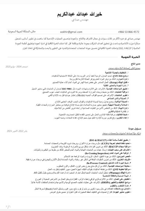مهندس صناعي خبرة أكثر من 3 سنوات في مجال الانتاج والجودة (الأغذية) ابحث عن عمل في شركة أو مصنع لدي خبرة في ادارة الجودة وتطبيق نظام (QMS, ISO 9001، HACCP, GMP) وادارة واشراف على الانتاج. وايظا لدي مهارات قيادية واداريه ولدي خبرة في نظام المحاسبه أونكس. مهارة عالية في استخدام البرامج الهندسيه وبرامج مايكروسوفت أوفيس. حاصل على الرخصة الدوليه لقيادة الحاسب الآلي. مستوى جيد جدا في اللغة الانجليزية