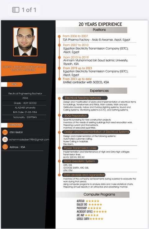 مهندس كهرباء مصري معتمد من هيئة المهندسين معتمد من شركة المياه الوطنية معتمد من شركة سار خبرة بأعمال الجهد المتوسط والجهد المنخفض والتيار الخفيف خبرة في أعمال التصميم، الشوب دروينج، التنفيذ، اجادة استخدام البرامج الهندسية، اعتماد المواد، حصر الكميات، عمل كافة المخططات، متابعة أعمال المشروع