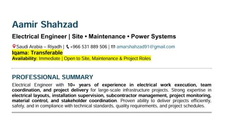 Electronics Engineer (Low Current) Bachelor’s degree in Electronics Engineering, with 10 years of experience in low current systems, installation, and maintenance. Based in Riyadh, transferable Iqama, available to join immediately