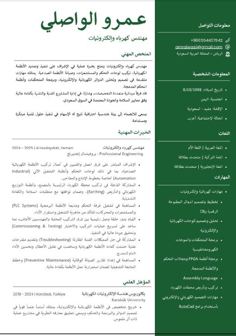 Electrical and Electronics Engineer based in Riyadh. One year of experience in field Supervision and installation of Industrial Control Systems (PLC) in Industrial projects. Competitive Advantages Graduated from Turkey. Fluent in Turkish and English. Certifications in Business Management, Data Analytics (Google Analytics) and Consumer Behavior. Contact (Ready to start immediately)