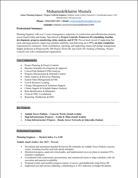 Open to Opportunities Planning/ Project Controls Engineer (KSA) I am currently seeking a new opportunity as a Planning/ Project Controls Engineer within EPC contractors, PMCs, or multinational construction organizations in Saudi Arabia. I bring over 6 + years of experience across infrastructure, fast - track, and mega projects, with hands - on expertise in Primavera P6 scheduling, project controls