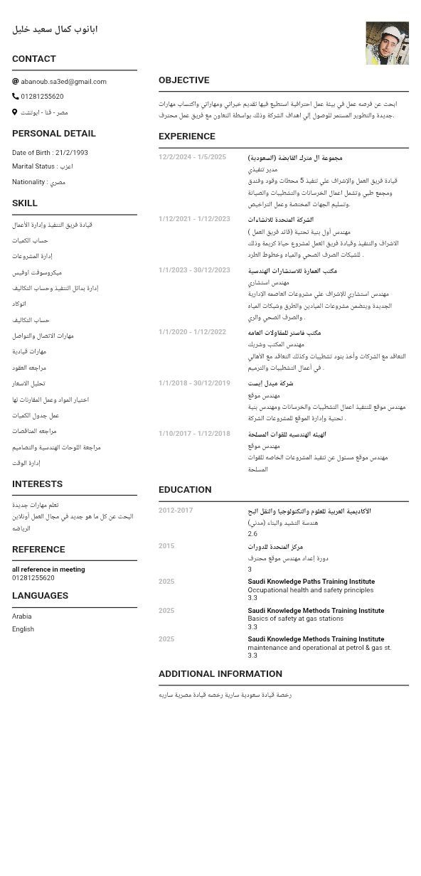 مهندس مدني خبرة 8 سنوات في مصر والسعودية أقوم بأعمال الاشراف على التنفيذ وحصر الكميات وتحليل الأسعار وعمل العقود ومراجعة اللوحات التصميمية ومتابعة الأعمال وإدارة المشروعات وعمل الجدول الزمني وأملك سجل انجازي في تسليم مشروعات معروفة في الرياض كما أستطيع التعامل مع الجهات الحكومية ومنصة اعتماد وعلي دراية كاملة بتسليم المشروعات للبلدية والدفاع المدني ابحث عن فرصة عمل في بيئة احترافية أستطيع