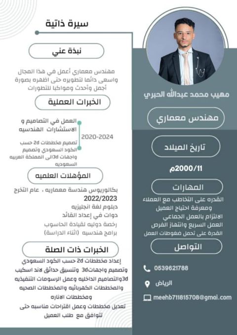 أنا مهندس معماري حديث التخرج، ابحث عن فرصة عمل مناسبة داخل مكتب هندسي. وأتقن مجموعة من البرامج الهندسية تشمل AutoCAD - Revit - SketchUp - Lumion - Photoshop. مهاراتي تشمل اعداد المخططات المعمارية واللوحات التنفيذية. تصميم الواجهات والنماذج ثلاثية الأبعاد. القدرة على العمل ضمن فريق وتحمل ضغط العمل. دقة عالية في التنظيم والتسليم. أسعى للانضمام الى بيئة عمل احترافية تتيح لي التطور واكتساب. وستدمه تش