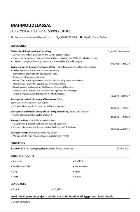 Experienced Surveyor and Technical Survey Office Engineer with over 5 years of hands - on experience in infrastructure, road, and large - scale construction projects across Saudi Arabia and Egypt. Proven expertise in travers design, control point establishment, GPS and total station works, and technical survey documentation. Strong background in road intersections, drainage networks, water and irrigat