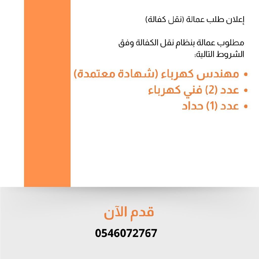 مطلوب عمالة بنظام نقل الكفالة وفق الشروط التالية مهندس كهرباء (شهادة معتمدة) خاصة على رخصة المهندسين عدد (2) فني كهرباء عدد (1) حداد. القصيم البكيرية