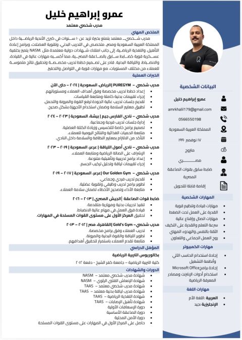 الإقامة سارية أنا حاليا مقيم في نجران، ولدي الاستعداد لبدء العمل فورا. الخبرة امتلك خبرة عملية تزيد عن خمس (5) سنوات في مجال التدريب الرياضي واللياقة البدنية، مع التركيز على برامج كمال الأجسام والتغذية الرياضية. الشهادات حاصل على شهادات تدريب معتمدة في مجال كمال الأجسام والتدريب الشخصي وصانع رياضي علي مواقع التواصل الاجتماعي