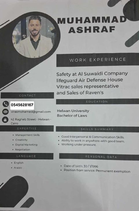 لايف جارد منقذ سباحة في الاتحاد المصري للانقاذ والغوص. اشتغلت في دار الدفاع الجوي 5 سنوات اشتغلت في شرم الشيخ في فندق شرمنج أن. لدي خبرة كبيرة في مجال الفنادق والأندية والجيمات. بالنسبة للأندية اللي عاوز بعد دوام الانقاذ أقوم بتدريب مصارعة رماني أو كيك بوكس تخصص من سن 4 سنوات الى 16 سنة تمام يبعتلي ارساله فيديوهات. الإقامة سارية شهر بغرض نقل كفالة