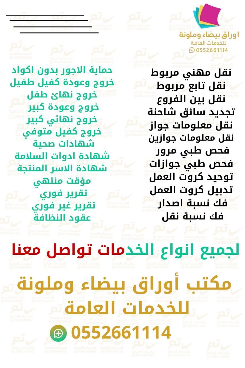 مكتب أوراق بيضاء وملونة جميع خدمات النسخ والتصوير ونقل الكفالة جميع م يخص الضمان وحساب المواطن وجميع القضايا ناجز تواصل معنا وكل م يخص العمل والعمال وكل م يخص الشركات المؤسسات والضرائب. ولا تشيل هم موقعنا القصيم بريده شارع الأمير سلطان بن عبد العزيز حي الصفراء