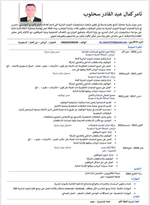 أنا مدير لقسم الموارد البشرية متمكن ذو خبرة تجاوزت العشرة أعوام داخل المملكة العربية السعودية حيث انني لدي المقدره علي تأسيس القسم من الصفر ومن أهم الامور التي اعمل بها (عمل الهيكله وهيكله الرواتب، العمل علي جميع المنصات الحكوميه، تنسيق الدورة المستندية بين الادارات، التدريب والتطوير، الاشراف علي عمليات ادارة الموارد البشرية بشكل كامل، متابعه التوظيف، تقليل الم نصرفات في القسم بشكل خاص وغيره)