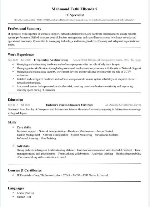 أنا متخصص في تقنية المعلومات (IT) مقيم في الرياض، وأسعى بفاعلية للحصول على فرصة عمل مناسبة. أتمتع بخبرة عملية في عدة مجالات تقنية، بما في ذلك الدعم الفني، صيانة الكمبيوتر، وإدارة الشبكات. تشمل خبرتي إدارة الأنظمة والشبكات، خاصة مع Windows Server، بالاضافة الى تركيب وإدارة البرامج. كما انني ماهر في تركيب وبرمجة أنظمة الانذار الحريق، وأنظمة (access control) وأنواع الكاميرات المختلفة