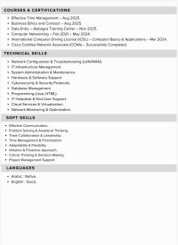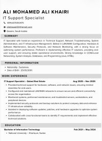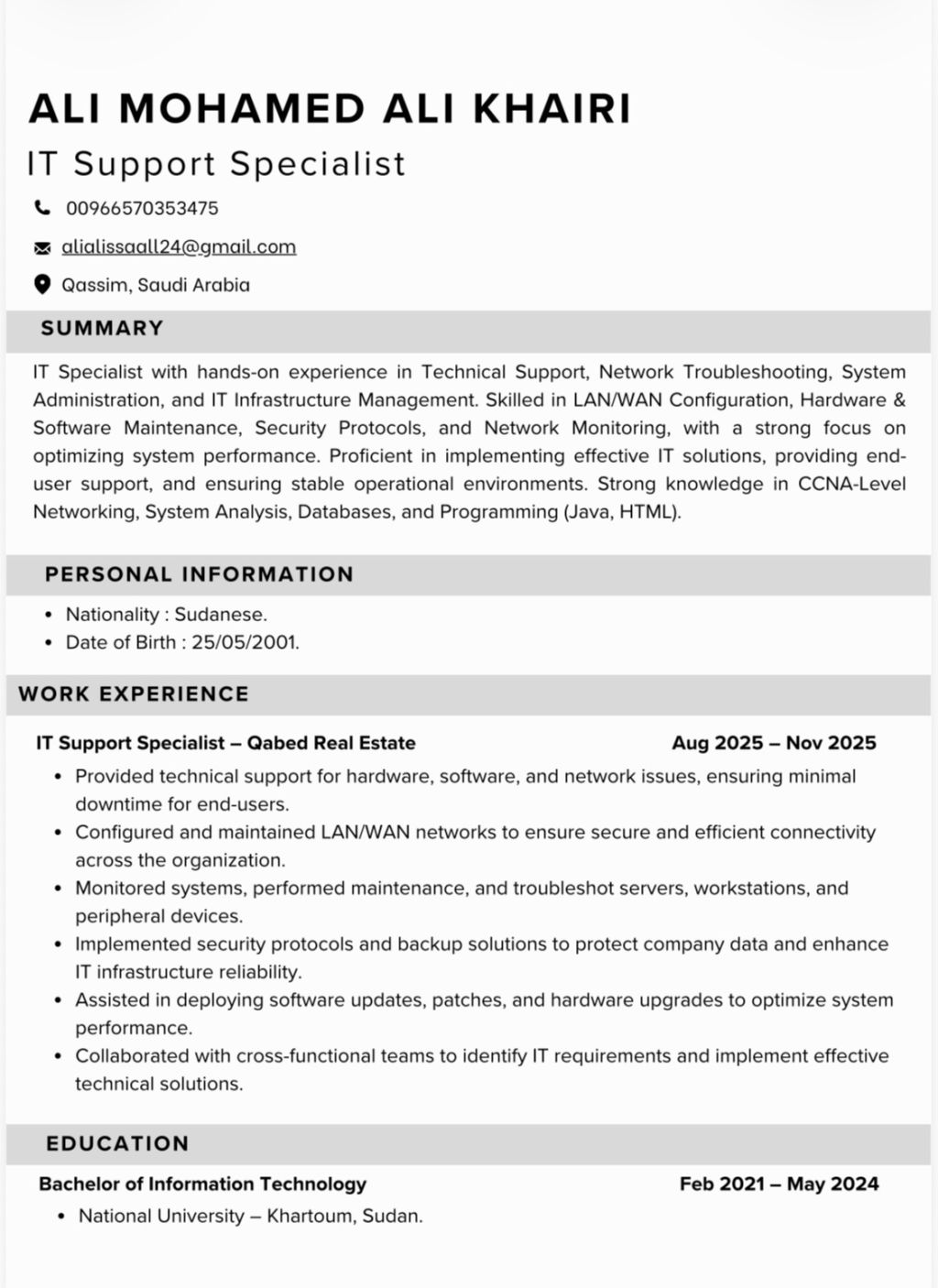 Ali Mohammed Ali, 24 years old, Sudanese nationality. Resident with residency and license, a graduate with a Bachelor’s degree in Information Technology. I am looking for a job or training. I am seeking work in the field of technology or technical support. I have good knowledge of computers, network management, and system maintenance. I have the desire to learn and develop my skills